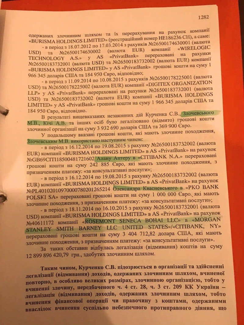 «В перiод з 18.11.2014 по 16.10.2015 з рахунку №26500183732001 (валюта USD) компанii «BURISMA HOLDINGS LIMITED» в AS «PRIVATBANK» на рахунок №40611172 компанii «ROSEMONT SENECA BOHAI LLC»… перерахованi грошовi кошти на суму 3 404 712,82 долара США, акi мають злочинне похождения, з призначенням платежу: «за консультативнi послуги».