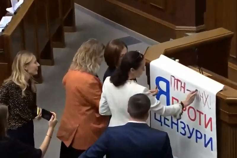 Група депутатів Верховної Ради з фракції “Опозиційна платформа – За життя” перед початком пленарного засідання вивісила на трибуні парламенту плакат “Я проти цензури”.