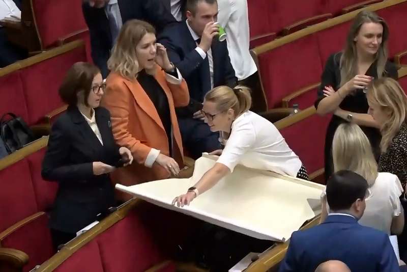 Плакат довго не провисів: спочатку інші депутати написали на ньому “ПТН – ПНХ”, а потім і зовсім зняли.