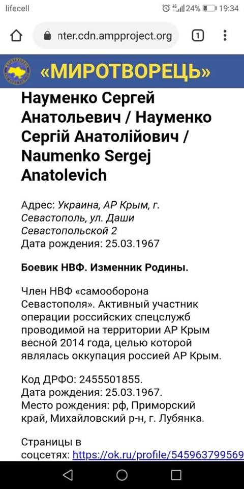Також на сайті вказано, що Науменко є бойовиком незаконних збройних формувань і активним учасником операції російських спецслужб, що проводиться на території Криму в 2014 році.