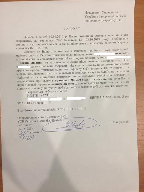 Отмечается, что СБУшника не пускают в отпуск, не платят надбавку и даже не оплачивают командировки. В рапортах на имя главы СБУ в Запорожской области Бориса Безрукого офицер посылает начальство «в эротическое путешествие» и требует разобраться в ситуации высшее руководство.