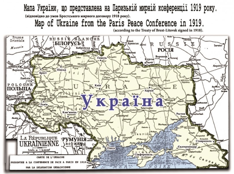 На Паризькій мирній конференції по завершенню Першої світової війни українська делегація декларує право на території розселення етнічних українців у Європі. Крим, Донбас, Галичина та Кубань – у переліку відповідних регіонів.