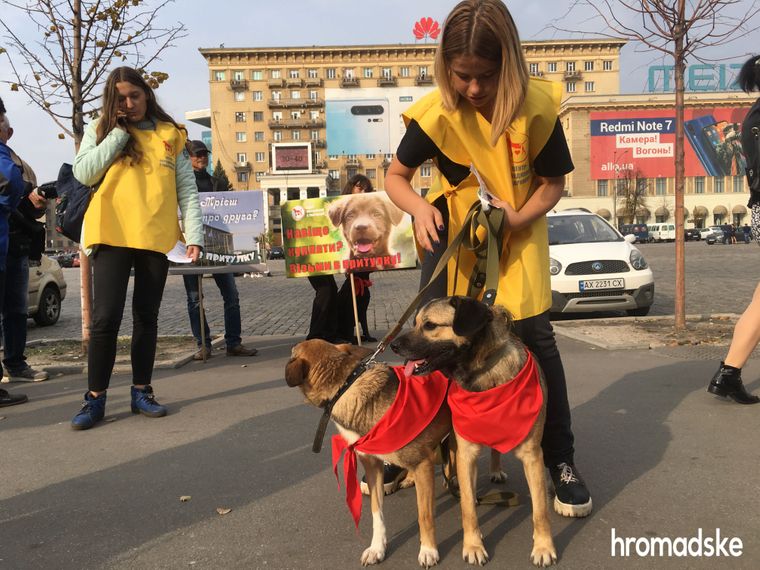 Собаки з муніципального притулку та волонтери харківського «Центру поводження з тваринами» вийшли на площу Свободи, аби привернути увагу містян до проблеми безпритульних тварин.