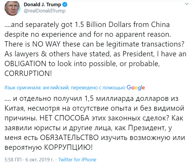 "Невероятно смотреть и читать Фейковые новости и то, как они делают все возможное, чтобы защитить Сонного Джо Байдена и его выброшенного из армии сына Хантера, который получал 100 000 долларов в месяц (плюс, плюс) от украинской компании, хотя у него не было опыта в энергетике, и отдельно получил 1,5 миллиарда долларов из Китая, несмотря на отсутствие опыта и без видимой причины. Эти транзакции не могут быть законными? Как заявили юристы и другие лица, как президент, я обязан изучить возможную или вероятную коррупцию!" - пишет Трамп.
