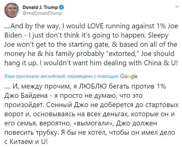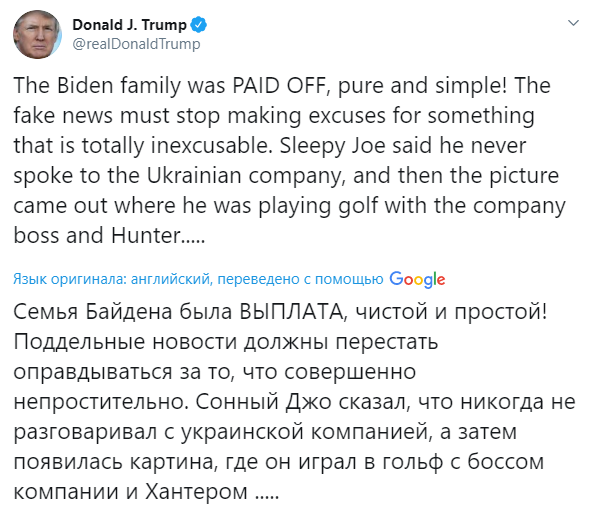 "Семье Байдена выплачивали. Ясно и просто! Фейковые новости должны перестать искать извинения за то, что совершенно непростительно. Сонный Джо сказал, что никогда не разговаривал с украинской компанией, а затем появилась фотография, где он играл в гольф с боссом компании и Хантером и, между прочим, я с удовольствием буду соревноваться с 1% Джо Байдена - я просто не думаю, что это произойдет. Сонный Джо не доберется до стартовых ворот и, основываясь на всех деньгах, которые он и его семья, вероятно, "вымогали", Джо должен повесить трубку. Я бы не хотел, чтобы он имел дело с Китаем и У[краиной]!", заключил Дональд Трамп.