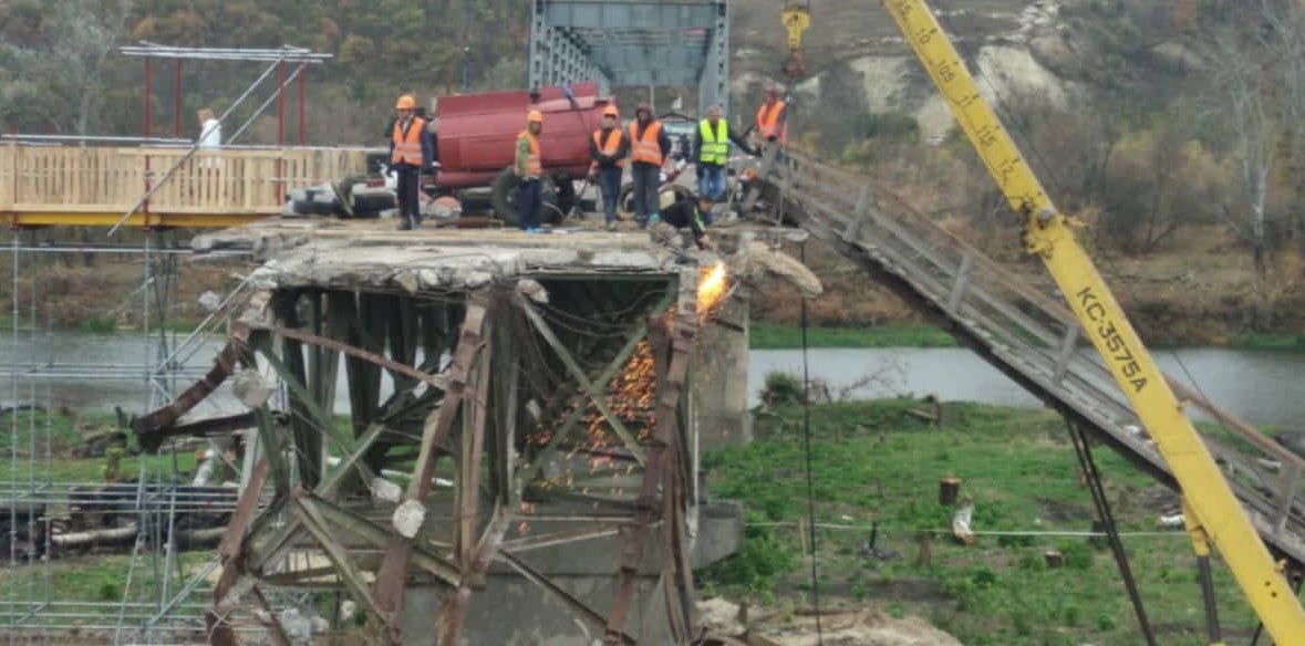 В Станице Луганской возле разрушенной части моста монтируют остановки