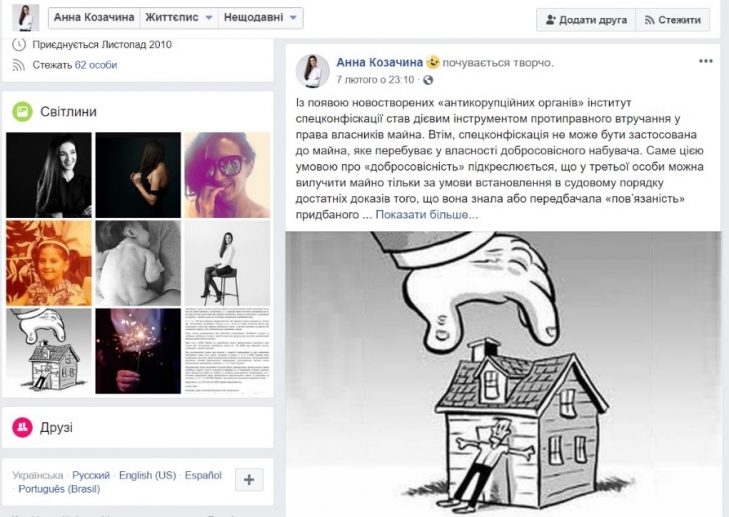 "Сергей Козачина является процессуальным руководителем множества досудебных расследований, которые ведет НАБУ. Он может влиять на принятие тех или иных процессуальных действий, оказывать влияние на сотрудников НАБУ. В тоже время его супруга как адвокат имеет прямую коммерческую заинтересованность в том, чтобы НАБУ согласилось на снятие ареста с квартир, которые являются вещественных доказательством в деле о хищении средств из банка "Хрещатик". Мы фактически имеем "семейный подряд". Жена прокурора обещает клиентам снять арест с квартир, купленных на краденные средства. Прокурор со своей стороны добивается, чтобы правоохранительные органы сквозь пальцы смотрели на то, что недвижимость "вернулась" собственникам, которые получили ее в результате аферы. От практикующих адвокатов, юристов поступает информация, что Анна Козачина систематически предлагает клиентам уладить проблемы с САП и НАБУ, ссылаясь на высокое положение ее супруга. Найти ее по такому поводу несложно – достаточно зайти на ее страницу в Фейсбук, где указан контактный телефон и email", - заявил представитель "Антикоррупционной платформы" Игорь Тыминский.