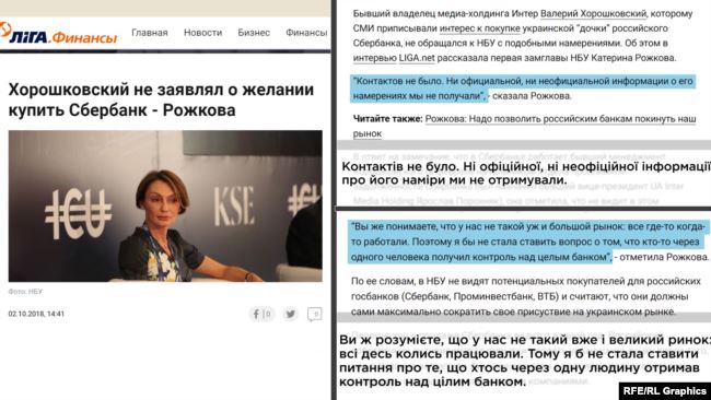 «Контактів не було. Ні офіційної, ні неофіційної інформації про його наміри ми не отримували, – наголошувала в інтерв’ю Рожкова. – Ви ж розумієте, що у нас не такий вже і великий ринок: всі десь колись працювали. Тому я б не стала ставити питання про те, що хтось через одну людину отримав контроль над цілим банком».