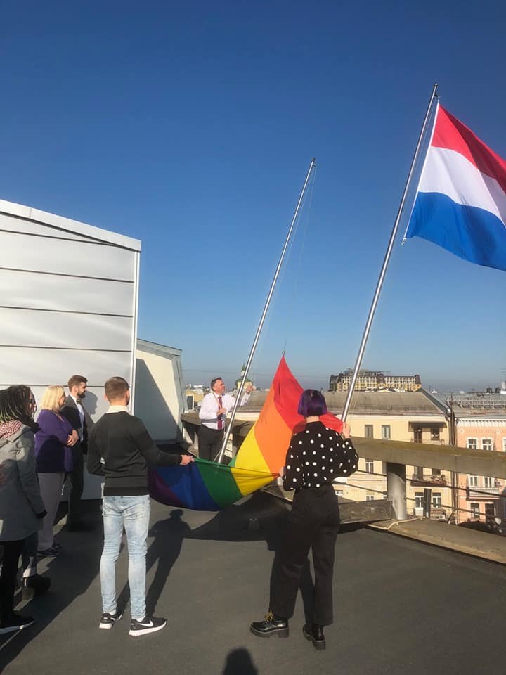 До Міжнародного дня камінауту над посольством Нідерландів в Україні підняли веселковий прапор.