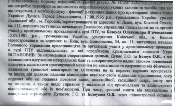 Якщо раптом Трепак призабув цю історію, наводимо витяг з постанови про заведення оперативно-розшукової справи відносно Тараса Омеляновича Дунаса та Олександра В’ячеславовича Білоуса категорії «перевірка» з класифікацією «прийняття пропозиції, обіцянки або одержання неправомірної вигоди службовою особою» за ознаками ч.4 ст. 368 КК України.