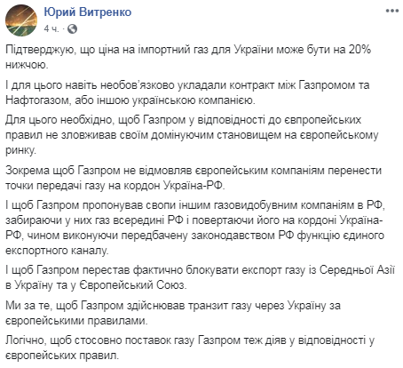 Также в публикации Витренко напомнил, что в арбитраж первым подал именно «Газпром».