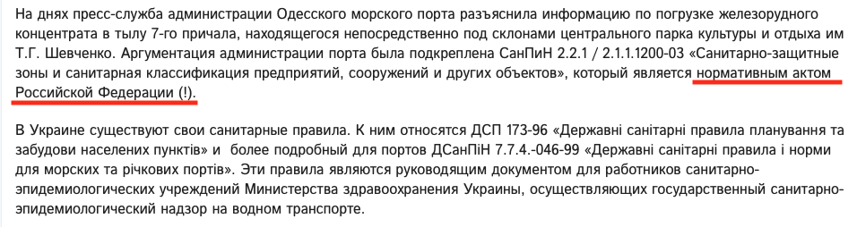 Но специалисты говорят иное: “Центральная парковая зона Одессы не является санитарно-защитной зоной порта по решению портовой администрации. Основные источники пыли в порту - это перевалка насыпных грузов: зерно, строительные и химические материалы; строительные работы и дорожное движение грузовых автомобилей. Частицы пыли проникают в дыхательные пути и усугубляют респираторные болезни, такие как астма. Отодвигать надо грузы, а не существующие жилые кварталы !!! В 500 метровую зону от погрузки руды в Одессе сегодня попадают жилые кварталы, детский сад, парк, стадион на 34 тысячи мест, 2 училища – то, что не может согласно ДСП 173-96 находиться в санитарно-защитной зоне”.