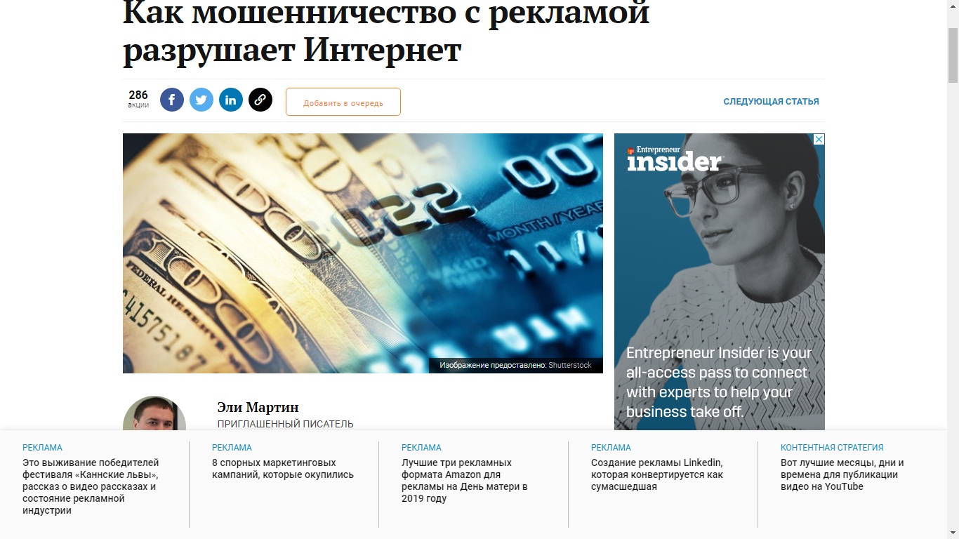 Інший відомий спеціаліст Елі Мартін, директор з продажу на eZanga.com, в статті «Як шахрайство з рекламою руйнує Інтернет»: ще у 2016 році застерігав - «В цьому році (2016) через шахрайства з рекламою будуть втрачені мільярди, а від ботів вийде до 37 відсотків показів реклами. Фактично рекламне шахрайство знаходиться на шляху до того, щоб стати другим за величиною організованим злочинним підприємством».