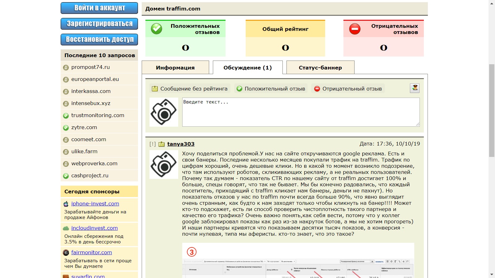 «Хочу поделиться проблемой.У нас на сайте откручивается google реклама. Есть и свои банеры. Последние несколько месяцев покупали трафик на traffim. Трафик по цифрам хороший, очень дешевые клики. Но в какой-то момент возникло подозрение, что там используют роботов, скликивающих рекламу, а не реальных пользователей. Почему так думаем - показатель CTR по нашему сайту от traffim достигает 100% и больше, спецы говорят, что так не бывает. Мы бы, конечно, радовались, что каждый посетитель, приходящий с traffim кликает нам банеры, деньги не пахнут). Но показатель отказов у нас по traffim почти всегда больше 90%, что явно выглядит очень странным, как будто к нам заходят только чтобы кликнуть на банер!!!! Может кто-то подскажет, есть ли способ проверить чистоплотность такого партнера и качество его трафика? Очень важно понять, как себя вести, потому что у коллег google заблокировал показы как раз из-за накруток ботов, а мы не хотим прогореть) И наши партнеры кривятся что показываем десятки тысяч показов, а конверсия - почти нулевая, типа мы аферисты. кто-то знает, что это такое?»
