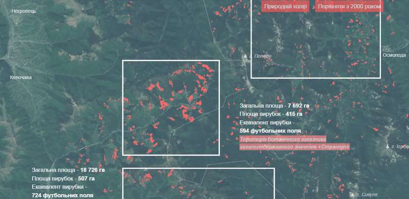Чтобы открыть интерактивную карту вырубки лесов, кликните сюда. Карта: texty.org.ua