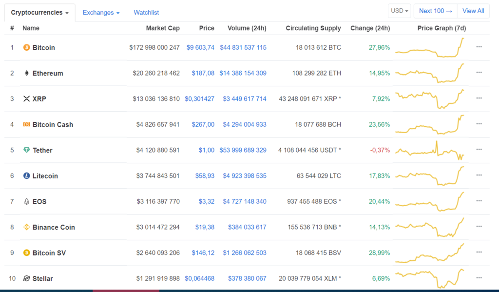 Так, только в первой десятке Ethereum вырос на 14,95%, Bitcoin Cash – на 23,56%, Litecoin – на 17,83%, EOS – на 20,44%, Bitcoin SV – на 28,99%.