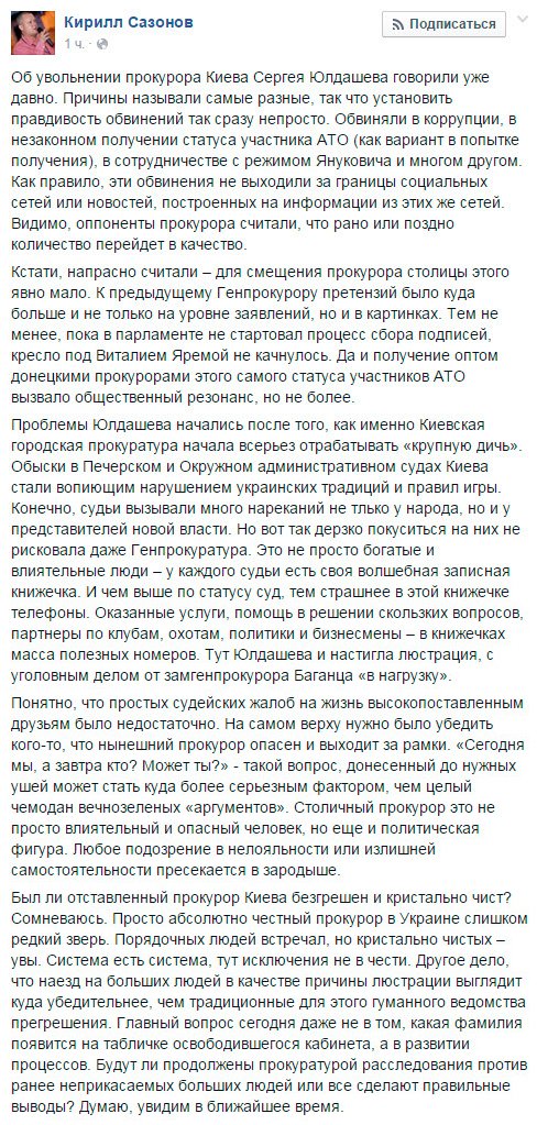 Чем запомнится Юлдашев столичным прокурорам? Пресс-обслуга уволенного заказала прославляющий некролог очередному "борцуну" за демократию из среды "демократических журналистов, и спешно разместили его на сайте Главком, который стал при Юлдашеве рупором прокуратуры Киева. Кроме искренней улыбки эти попытки представить прокурора "жертвой" у знающего люда не вызвали, а откровенная чепуха по тексту (вроде того, что Юлдашев пытался получить статус участника АТО и за это собственно его и прессовали) и вовсе ставят под сомнение квалификацию автора исполнения заказухи. Таким нелепым, как некролог, и стало прокуроство в столице Юлдашева.