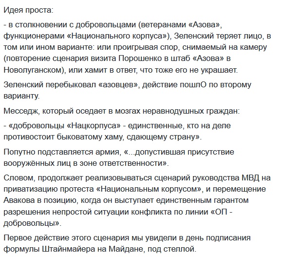 «В столкновении с добровольцами (ветеранами „Азова“, функционерами „Национального корпуса“), Зеленский теряет лицо, в том или ином варианте: или проигрывая спор, снимаемый на камеру (повторение сценария визита Порошенко в штаб „Азова“ в Новолуганском), или хамит в ответ, что тоже его не украшает. Зеленский перебыковал „азовцев“, действие пошлО по второму варианту», — пишет блогер.