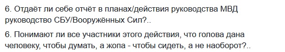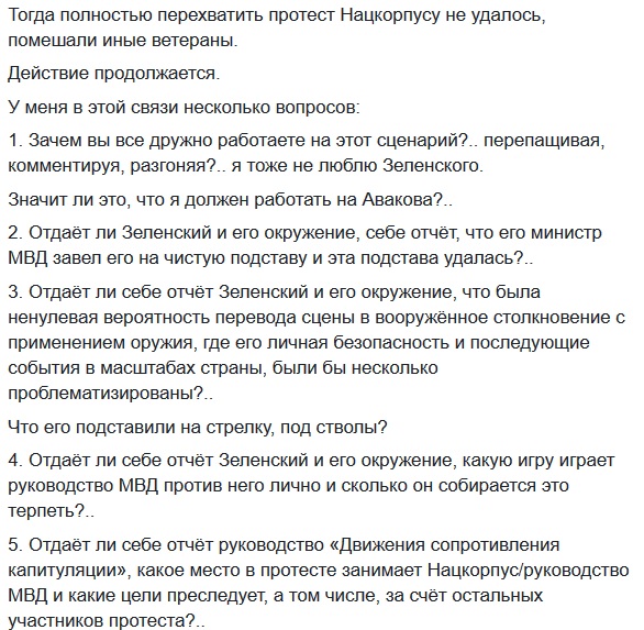 «Что же значит вчерашняя, постановочная сцена, когда полицейский Вадим Троян завёл президента страны к группе вооружённых неизвестных, занявших оборону в непосредственной близости к линии боевого соприкосновения?.. 1. Варианты: а) Зеленский шёл туда под очень серьёзные, формально оговорённые гарантии безопасности, в противном случае УДО никогда бы его туда не допустило. б) решение было спонтанным, на месте. В таком случае гарантией выступал сам Троян, заместитель министра внутренних дел. В любом случае, организованная группа лиц с оружием была ранее пропущена в указанный район конкретными сотрудниками/военнослужащими МВД Украины, которые несли службу в конкретное время, на конкретном КПП, обеспечивая режим. 2. Это значит, что вчера реализовывался сценарий руководства МВД, простыми словами — „подстава“», — написал он в Facebook.