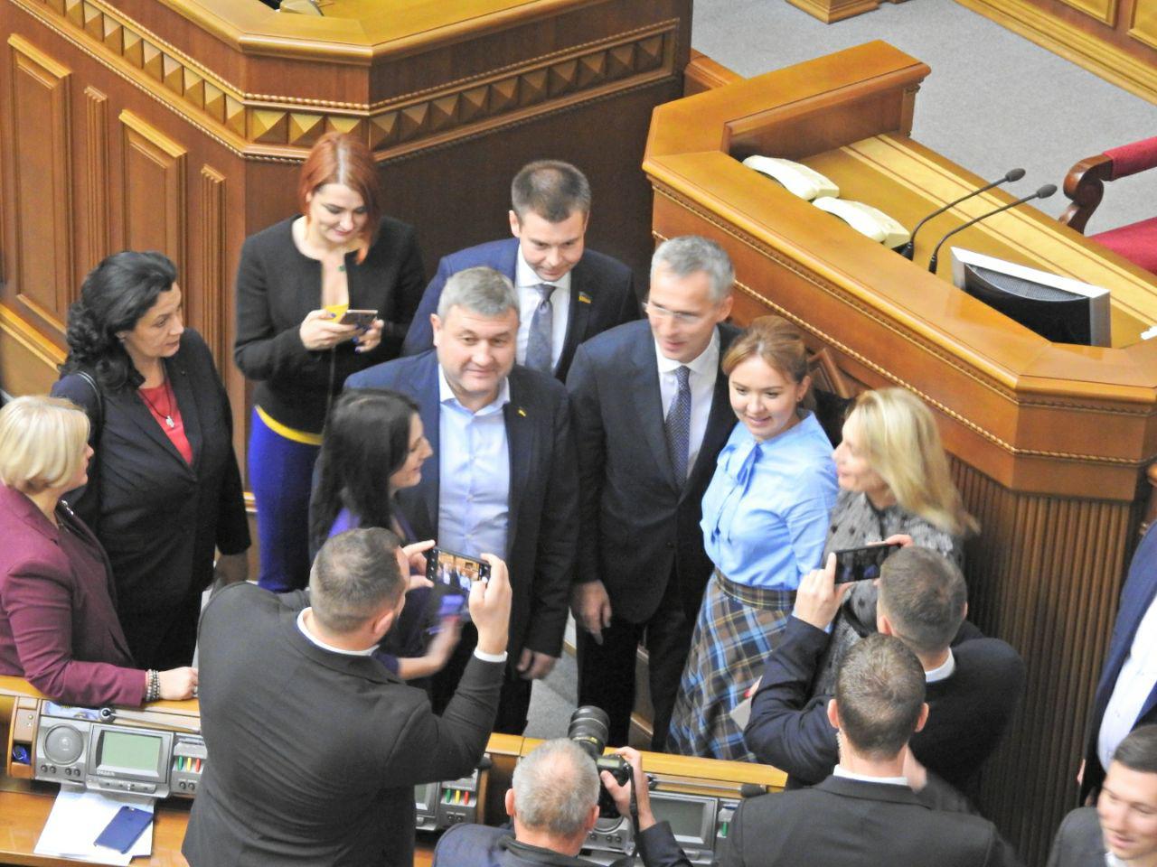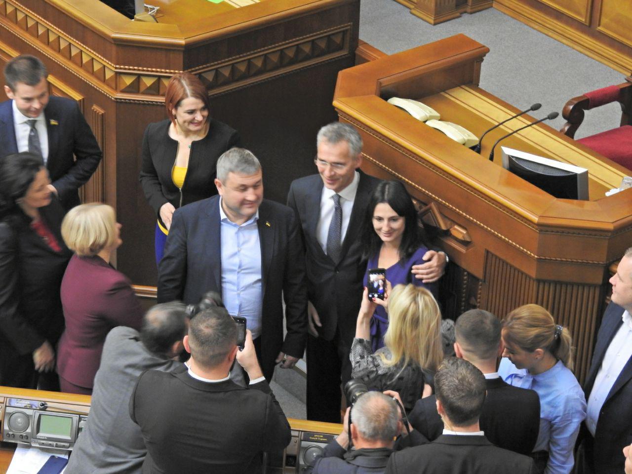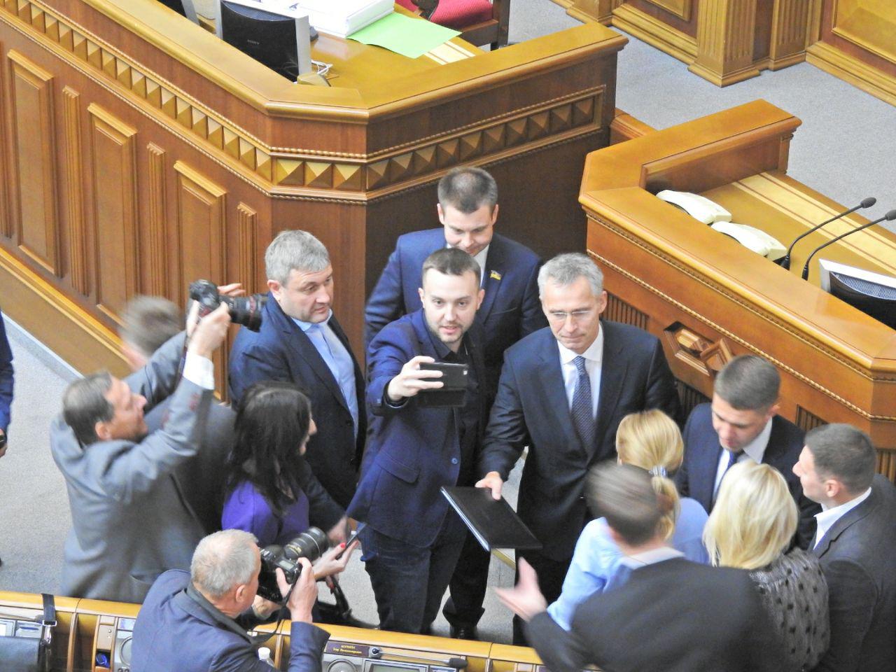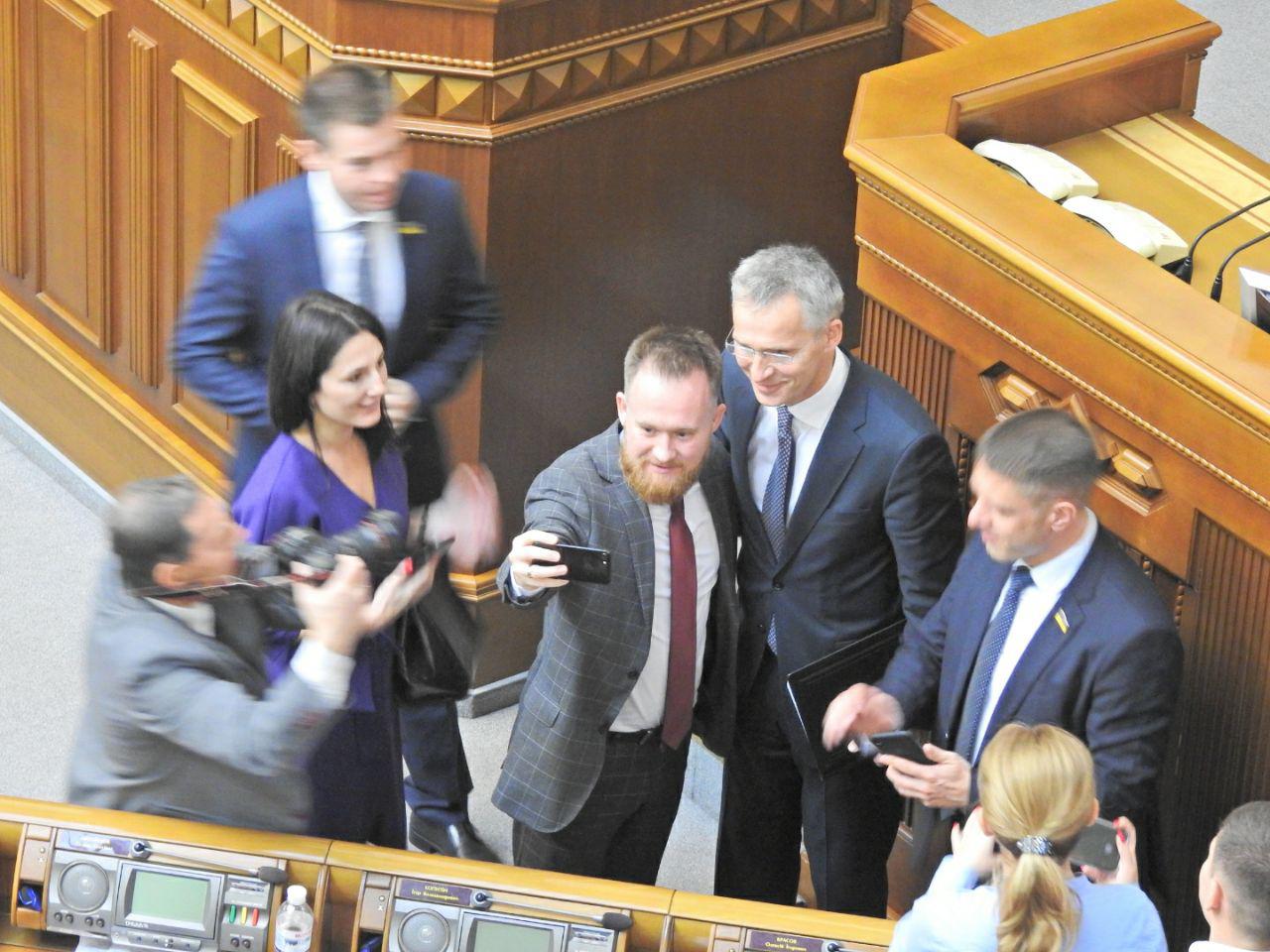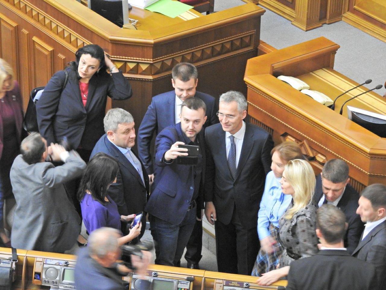 Народні депутати були настільки раді бачити у стінах парламенту Генерального секретаря НАТО Йенса Столтенберга, що влаштували з ним фотосесію.