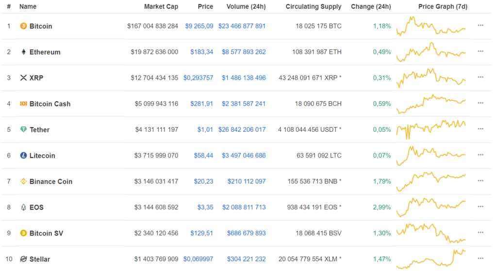 Другие главные цифровые валюты тоже стали дорожать. В топ-10 самых дорогих заметнее всего взлетел EOS – на 2,99% за сутки. Stellar вырос на 1,47%, а Bitcoin SV – на 1,3%. Заметно вырос и Binance Coin – сразу на 1,79%.