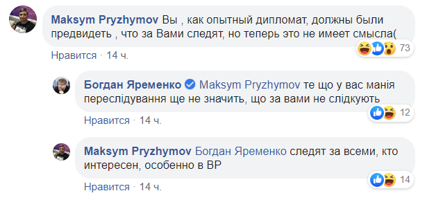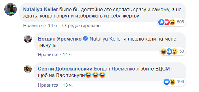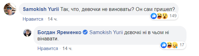 После того как народный депутат Богдан Яременко (фракция «Слуга народа») написал заявление о сложении полномочий главы комитета по вопросам внешней политики, под его постом в Facebook появилось множество шутливых комментариев касательно секс-скандала с ним, на многие из которых он также отвечал.