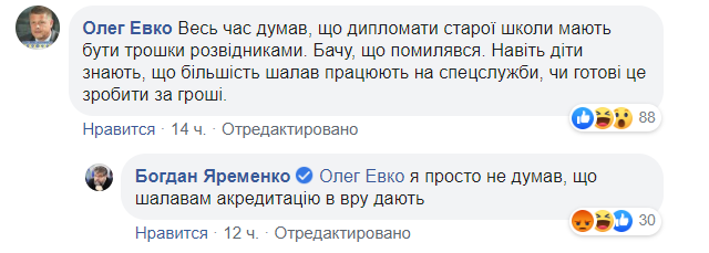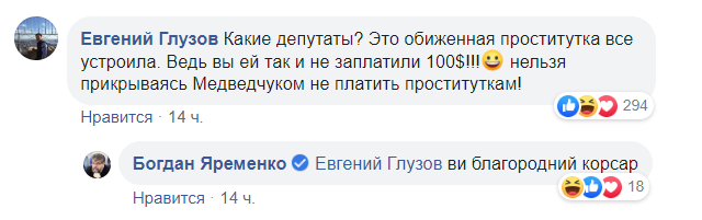 «Какие депутаты? Это обиженная проститутка все устроила. Ведь вы ей так и не заплатили 100$! Нельзя прикрываясь Медведчуком не платить проституткам!» — говорится в другом комментарии, на что Яременко парировал фразой «Вы благородный корсар».
