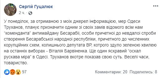 Добавим также, что параллельно начали курсировать слухи, что новым вице-мэром Одессы может стать бывший нардеп Виталий Барвиненко. Активист Сергей Гуцалюк написал в Facebook, что в этот понедельник Геннадий Труханов планирует назначить его своим заместителем.
