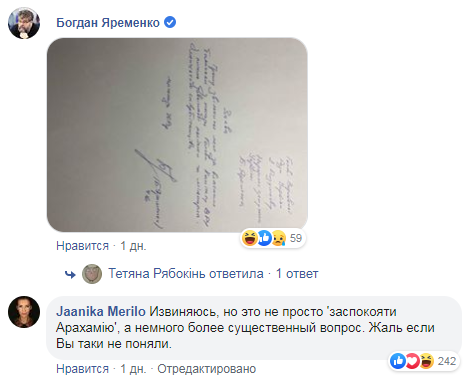 «С целью спасения украинского парламентаризма от меня, а украинской журналистики в лице сайта «Буквы» от статьи 163 и 182 Уголовного кодекса Украины, и учитывая мелкий политический шантаж трех фракций парламента, я написал заявление о сложении полномочий председателя комитета. Написал, говоря через Давида Арахамия мне передали, что для трех фракций будет достаточно, если до 19:00 я сообщу о заявлении об отставке лично в посте в фб. Копию заявления, чтобы успокоить Давида и три фракции парламента, я вывешу в комментариях чуть позже, потому что сейчас им янтыки в лучшем месте Киева. Фотокопия заявления не позднее 23-00 будет размещена в комментариях к этому посту, — пообещал скандальный нардеп.