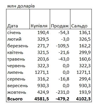 В течение октября НБУ купил на межбанке валюты на 424,9 млн долларов и продал на 231,0 млн долларов. Сальдо сократилось до 193,9 млн долларов.