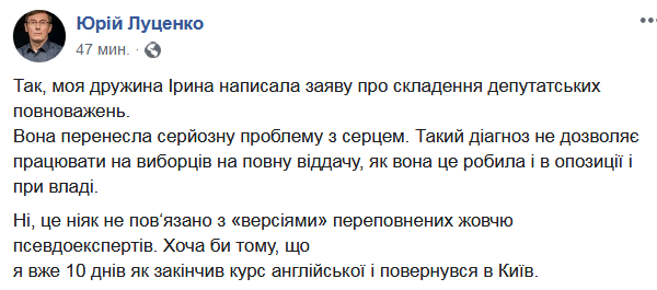 Супруг Ирины Луценко, бывший генпрокурор Юрий Луценко, подтвердил причину прекращении депутатских полномочий Ириной по состоянию здоровья: “Да, моя жена Ирина написала заявление о сложении депутатских полномочий. Она перенесла серьезную проблему с сердцем”.