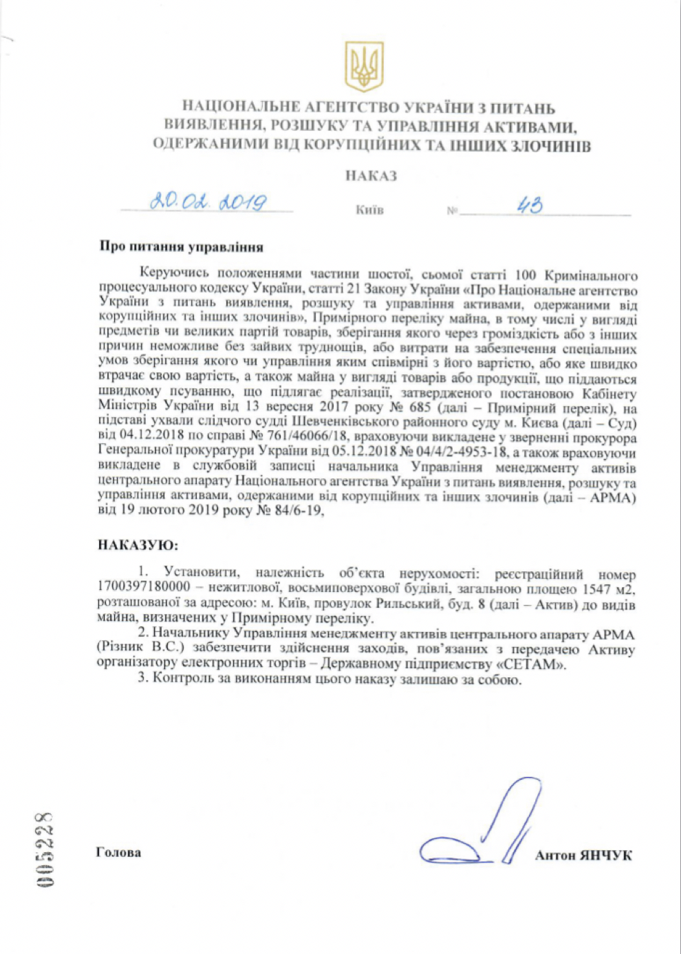На виконання свого злочинного задуму Антон Янчук й прийняв 20.02.2019 свій наказ № 43 про питання управління, згідно з яким передав восьмиповерхову адміністративну будівлю комітетів Верховної Ради для реалізації в ДП «Сетам».