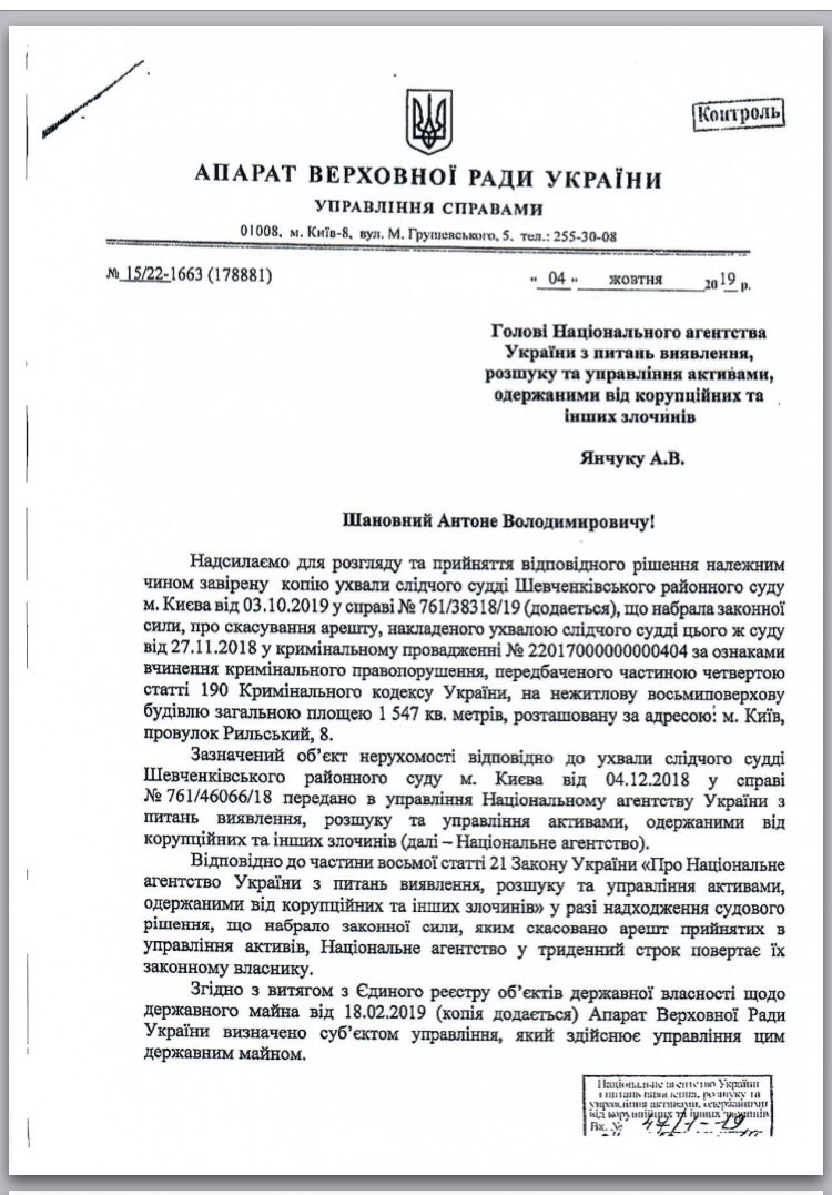 04.12.2018 ухвалою слідчого судді Шевченківського районного суду м. Києва у справі № 761/46066/18 ця адміністративна будівля була передана в управління АРМА.