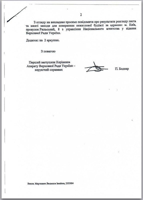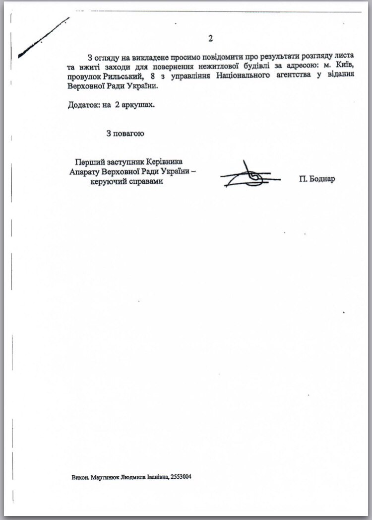 Особливо хотілось би почути думку Генерального прокурора з приводу спроби Антона Янчука крадькома продати восьмиповерхову адміністративну будівлю комітетів Верховної Ради України, що знаходиться в самому центрі міста, поряд з Софійським собором (м. Київ, провулок Рильського, будинок 8).