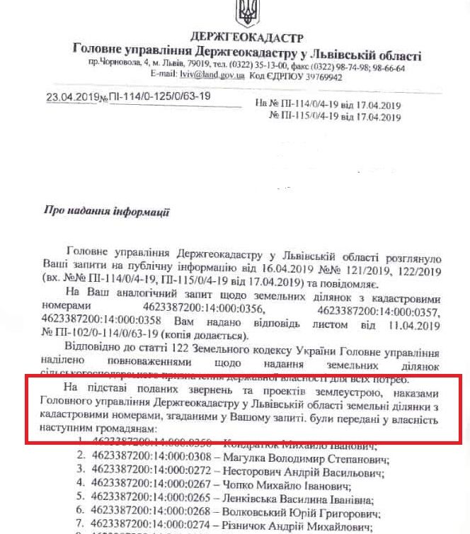 «Среди владельцев участков по 2 га, из которых были сформированы участки для Кривецького, были и одиозные львовские активисты. В частности, известные участием в уличных акциях во Львове члены «Украинского союза участников АТО» и основатели жилищно-строительных и обслуживающих кооперативов «Патриот-1, -2, -3». Это Олег Дудок, Андрей Ризничок и Константин Дерюгин», — сказано в материале.