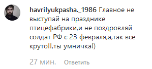 «Если вы вне политики, то для чего эти оправдания и уточнения? Для чего эти флаги? Кому какое дело от какой вы страны? Вы от мира музыки и этого достаточно. Сами даёте повод себя отчитывать и клеветать, тем, что придаёте этому вопросу такую важность», «До этого поста нормально относилась, теперь вижу какое оно…», «Главное не выступай на празднике птицефабрики, и не поздравляй солдат РФ с 23 февраля, а так всё круто!», — шла речь в комментариях.
