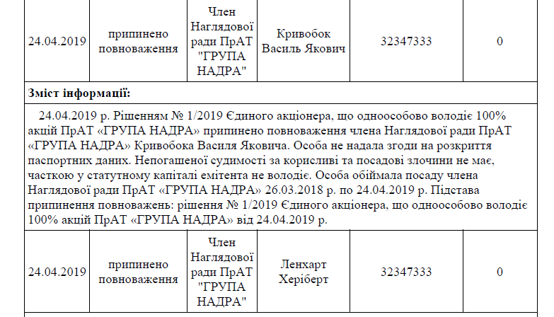 Эту компанию официально контролирует бизнесмен Павел Загороднюк, сын которого Андрей Загороднюк в августе нынешнего года возглавил Министерство обороны Украины, а позднее стал членом СНБО. При этом Павел Загороднюк должен очень хорошо знать Василия Кривобока, поскольку последний, как выяснили, до апреля 2019 года был членом наблюдательного совета группы «Надра» – то есть фактически работал на Загороднюка.