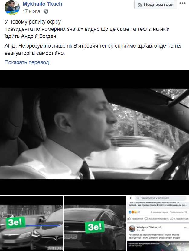 В свою очередь, журналист Схем Михаил Ткач заявил, что Tesla в которой снимается видеоролик президента, принадлежит Андрею Богдану.