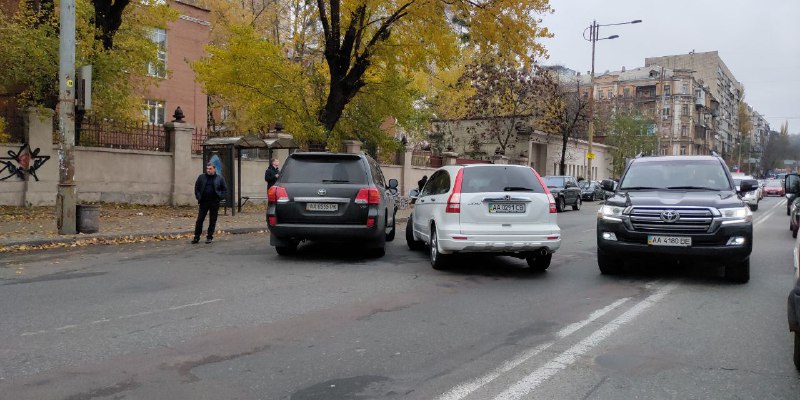 В центре Киева, на улице Льва Толстого, 53 столкнулись два внедорожника Honda CR-V и Toyota Land Cruiser 200 Столкновение произошло на встречной полосе дороги.
