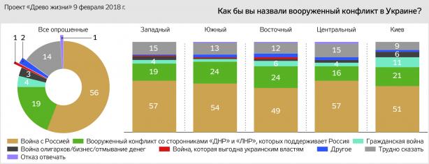 Полтора года назад издание ЗН совместно с «Небесной гвардией» Анастасии Березы и социологами КМИС провело опрос более половины семей украинцев, потерявших в войне с боевиками сыновей, дочерей, отцов и мужей. Им задавался схожий вопрос. 56% опрошенных родственников погибших считают вооруженный конфликт в Украине войной с Россией. Сегодня многие в Л/ДНР понимают, что русскоговорящие граждане Украины не притесняются за свой родной русский язык. Таких 45,9%. Полностью уверены в притеснениях всего 19,4%, и почти уверены в этом 34,1%.