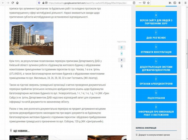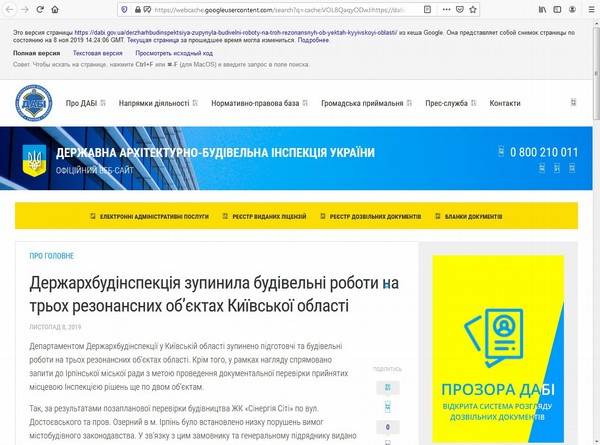 Идем дальше. Обратившись к всемогущей поисковой системе Google, нам предоставляется прекраснейшая возможность лицезреть сохраненную копию якобы несуществующей страницы. И тут мы видим, что данная страница была просто-напросто удалена, а заявление об остановке строительных работ на трех резонансных объектах Киевской области действительно опубликовывалась ранее на официальном сайте ГАСИ. Учитывая, что кэш поисковика Google может быть подчищен после нашей публикации, мы предлагаем нашему читателю ознакомиться со скриншотами удаленной страницы.
