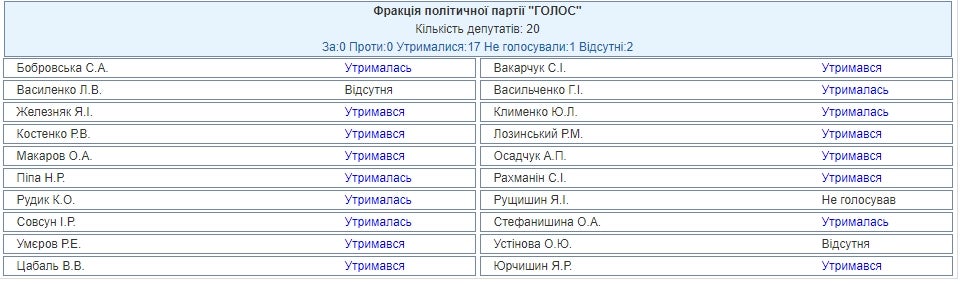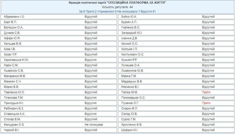 ОПЗЖ, которая с утра блокировала трибуну парламента, почти полностью покинула заседание. В зале Рады остались только Михаил Папиев и Александр Пузанов. Они проголосовали против.