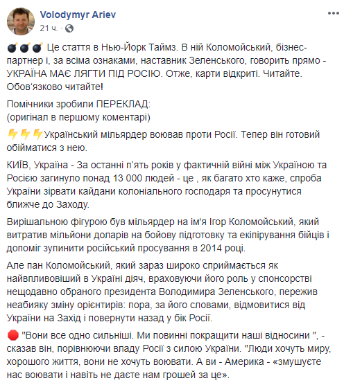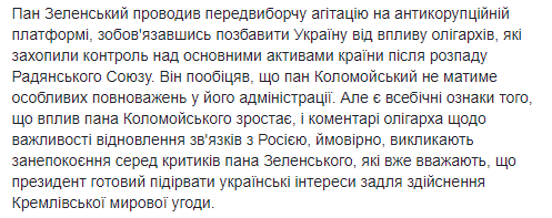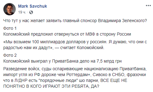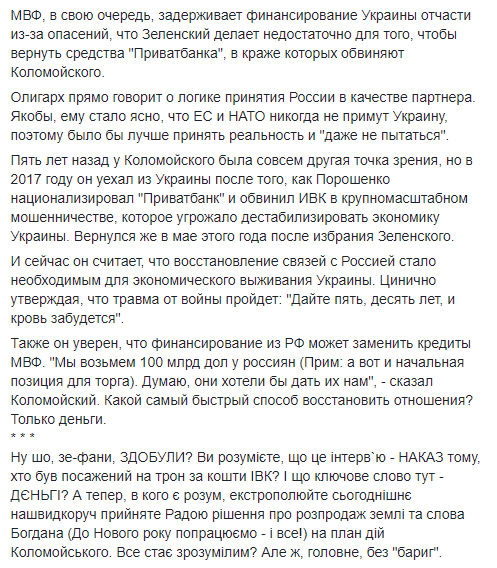 Новая позиция олигарха, которого многие считали патриотом, относительно отношений с РФ может быть связана, в первую очередь, с заявлениями МВФ, других международных организаций, команды Владимира Зеленского о категорическом отказе возвращать “ПриватБанк” ему и его партнеру Боголюбову. В интервью он подчеркивает намерения вернуть банк в свою собственность и получить компенсацию.