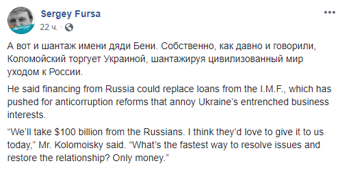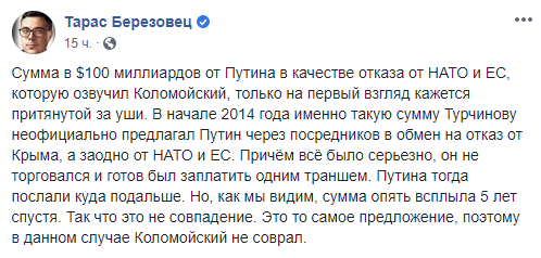 Политолог Тарас Березовец акцентирует на сумме в сто миллиардов долларов, озвученной Коломойским. Березовец напомнил, что такую же сумму уже предлагали Украине за сдачу национальных интересов.