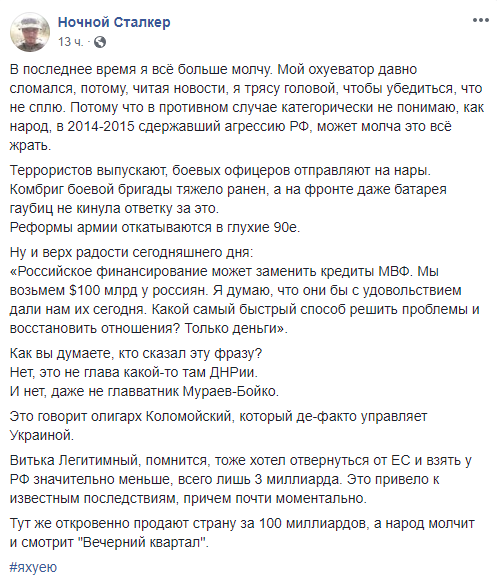 Офицер ВСУ под ником Ночной Сталкер шокирован заявлением олигарха и напомнил о бывшем президенте Украины Викторе Януковиче, который взял деньги у РФ.