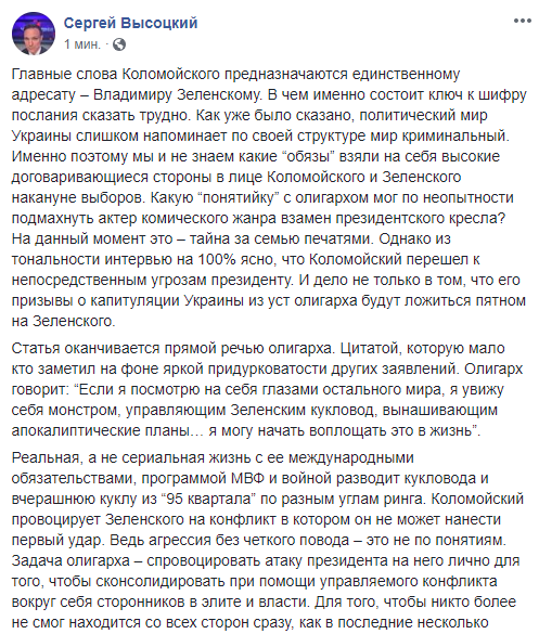 Журналист Сергей Высоцкий думает, что интервью Коломойского адресовано Зеленскому.