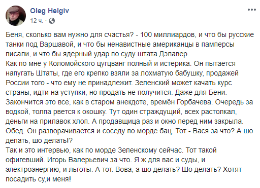 Блогер Олег Хельгив сравнил интервью олигарха с ударом в лицо Зеленскому.