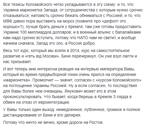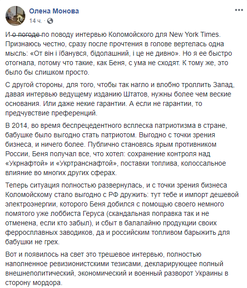 Блогер Олена Монова пишет, что Коломойский действует ситуативно и сейчас ему выгодно сотрудничество с РФ.