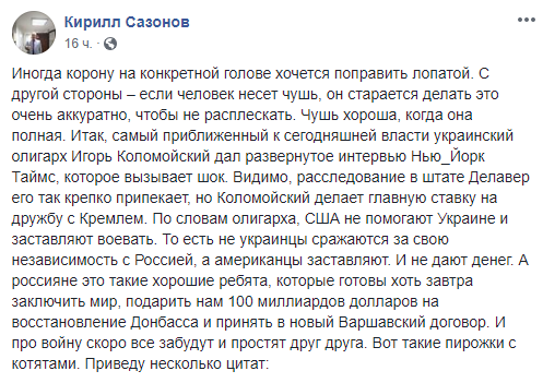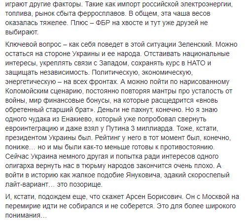 Политолог Кирилл Сазонов также считает, что олигарху выгодно заигрывание с Москвой. Сазонов отметил, что с нетерпением ждет реакции на заявления Игоря Коломойского президента Владимира Зеленского и министра внутренних дел Арсена Авакова.