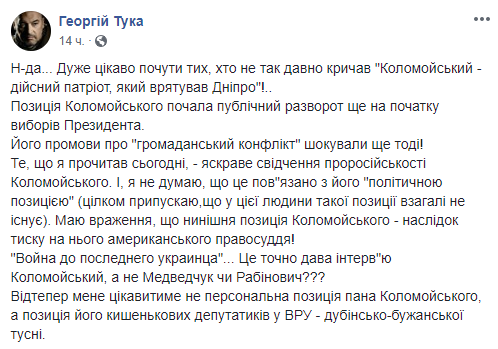 Волонтер и бывший Председатель Луганской областной военно-гражданской администрации Георгий Тука напомнил, что Коломойский изменил позицию еще в начале президентских выборов.